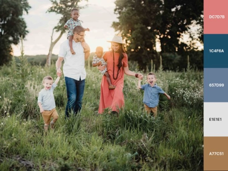 Particularly well-suited for spring and summer family photos, the combination of denim, peach, and blue produces a wonderfully fresh and fun colour palette. This palette produces photographs that are both aesthetically beautiful and faithfully accurate of family interactions since it finds the ideal mix of informal comfort and artistic appeal. Den jeans, a fabric firmly rooted in informal American fashion, gives the pictures a laid-back and friendly vibe; the delicate peach and cool blue colours offer a little of whimsy and brightness.