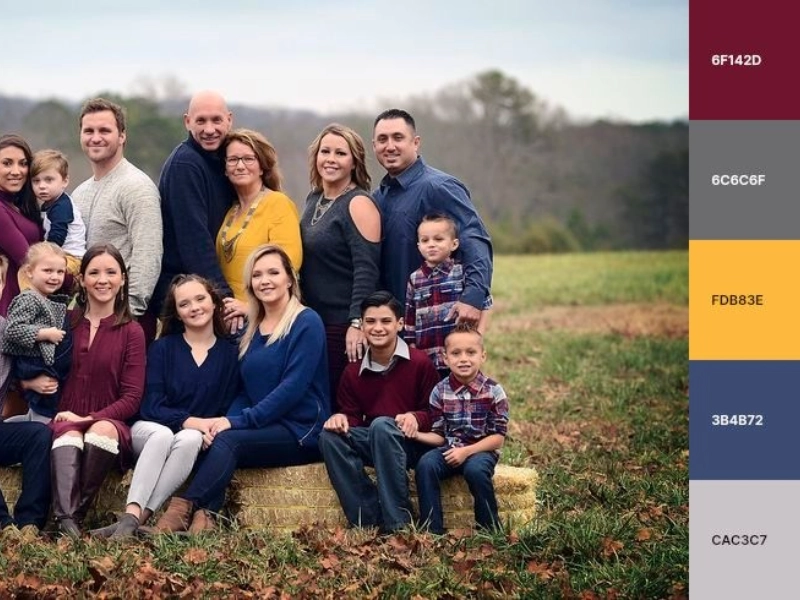 Using this colour palette calls for balance most of all. Grey is a suitable base colour; accent colours may be red and mustard yellow. This guarantees that the general appearance stays harmonic and not unduly cluttered. Family members might, for instance, dress mostly in grey and accentuate little clothes pieces or accessories in mustard yellow and red. Alternatively, you might have a mix of clothes whereby some family members adhere to grey while others wear more red or mustard yellow, therefore producing a varied yet harmonic group image.